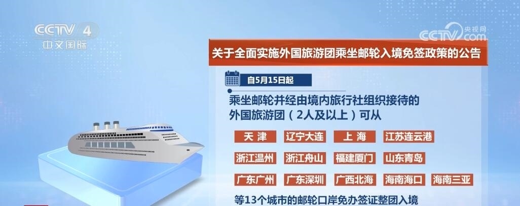 央視網(wǎng)消息:中國國家移民管理局發(fā)布公告,為進(jìn)一步促進(jìn)便利外籍人員來華旅游,自5月15日起,在中國沿海省份全面實(shí)施外國旅游團(tuán)乘坐郵輪入境免簽政策,乘坐郵輪來華并經(jīng)由境內(nèi)旅行社組織接待的外國旅游團(tuán)可從中國沿海所有郵輪口岸免辦簽證入境停留15天。