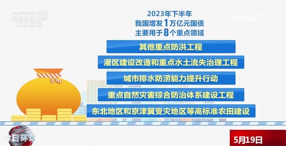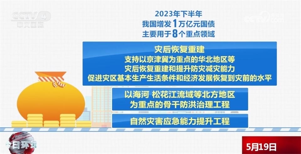 去年下半年,我國增發(fā)了1萬億元國債,主要用于8個重點領(lǐng)域,包括災(zāi)后恢復(fù)重建,支持以京津冀為重點的華北地區(qū)等災(zāi)后恢復(fù)重建和提升防災(zāi)減災(zāi)能力,促進災(zāi)區(qū)基本生產(chǎn)生活條件和經(jīng)濟發(fā)展恢復(fù)到災(zāi)前的水平,以海河、松花江流域等北方地區(qū)為重點的骨干防洪治理工程,自然災(zāi)害應(yīng)急能力提升工程,其他重點防洪工程,灌區(qū)建設(shè)改造和重點水土流失治理工程,城市排水防澇能力提升行動,重點自然災(zāi)害綜合防治體系建設(shè)工程,東北地區(qū)和京津冀受災(zāi)地區(qū)等高標(biāo)準(zhǔn)農(nóng)田建設(shè)。