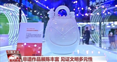 這是國(guó)家級(jí)非遺邢窯白瓷,它是根據(jù)河北衡水故城縣出土的唐代文物白釉鳳首蓋貼花皮囊壺創(chuàng)作的,呈現(xiàn)的是古代中原制瓷技藝與游牧民族文化的融合。
