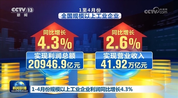 央視網(wǎng)消息(新聞聯(lián)播):記者今天(5月27日)從國家統(tǒng)計局發(fā)布的最新數(shù)據(jù)了解到,1—4月份,全國規(guī)模以上工業(yè)企業(yè)實現(xiàn)利潤總額20946.9億元,同比增長4.3%;實現(xiàn)營業(yè)收入41.92萬億元,同比增長2.6%。企業(yè)利潤繼續(xù)保持平穩(wěn)增長,企業(yè)營收持續(xù)改善。