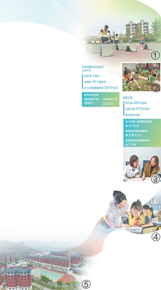 圖①:孩子們?cè)谏象w育課。人民網(wǎng)記者 王 波攝 圖②:孩子們?cè)谏蟿趧?dòng)課。圖③:之江小學(xué)教師(右)在浙江交流學(xué)習(xí)。受訪者供圖 圖④:老師在為五年級(jí)一班的孩子輔導(dǎo)作業(yè)。圖⑤:之江小學(xué)校園。圖②④⑤均為本報(bào)記者宋豪新攝數(shù)據(jù)來(lái)源:農(nóng)業(yè)農(nóng)村部、浙江省教育廳、四川省教育廳