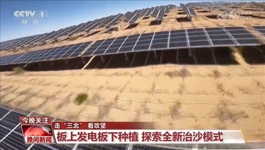 總臺記者 李欣蔓:治沙的腳步不但沒有停,還在不斷探索新的治沙模式?,F在我們看到的是鄂爾多斯一個已經建好、并網發(fā)電的光伏項目,板上發(fā)電,板下種植,一個空間全方位利用。三重防線,構建起了全新的生態(tài)治沙模式。有一個數據值得我們關注,這里的光伏項目占地39萬畝,與此同時,生態(tài)治理面積也將規(guī)劃完成39萬畝。在國家推進光伏治沙項目開發(fā)建設的進程中,我們看到越來越多的企業(yè)參與其中,在發(fā)展新能源產業(yè)的同時共同擔負起治沙的責任,為一片藍海,一片綠洲的建設,貢獻更多的力量。
