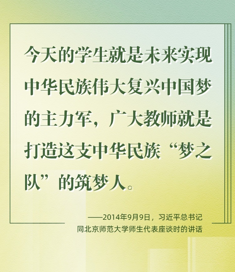 因為熱愛,所以一生堅持。老師是中華民族“夢之隊”的筑夢人,是新時代的“大先生”。從傳播知識、啟迪思想、無私奉獻(xiàn),到“讓每個人都有實現(xiàn)夢想的機(jī)會”;從教書到育人,從個人到家國,從小我到大我,“培養(yǎng)德智體美勞全面發(fā)展的社會主義建設(shè)者和接班人”,老師,已然是喚起一代代學(xué)子追隨先輩、培養(yǎng)家國情懷、櫛風(fēng)沐雨、砥礪前行的力量。