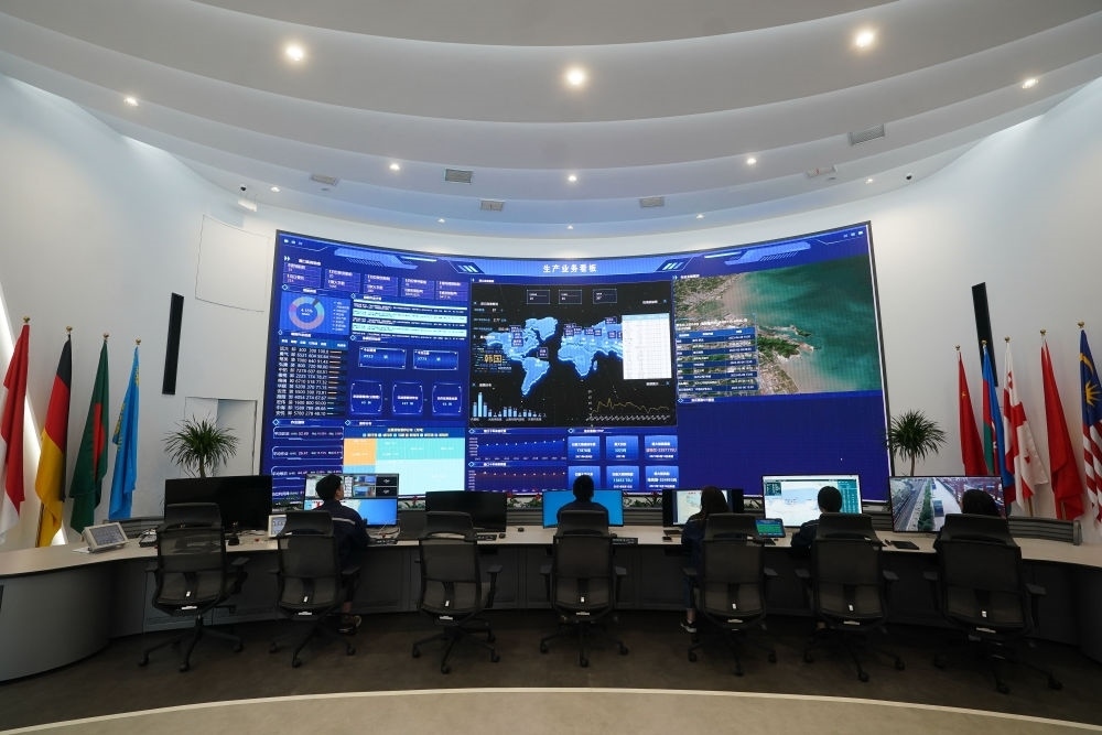 2023年5月9日,工作人員在中哈連云港物流合作基地?cái)?shù)字化調(diào)度中心查看實(shí)時(shí)作業(yè)數(shù)據(jù)。