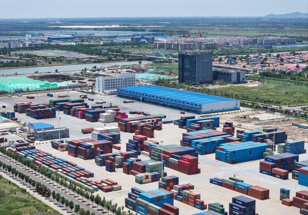 上合組織(連云港)國(guó)際物流園內(nèi)的集裝箱場(chǎng)站(2024年6月26日攝,無(wú)人機(jī)照片)。
