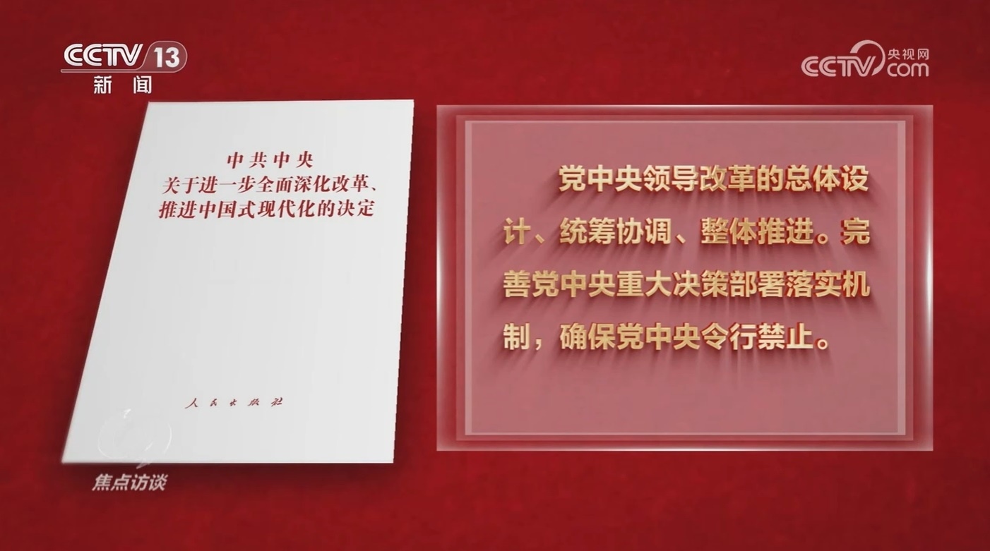 《決定》提出:黨中央領(lǐng)導(dǎo)改革的總體設(shè)計、統(tǒng)籌協(xié)調(diào)、整體推進(jìn)。完善黨中央重大決策部署落實機(jī)制,確保黨中央令行禁止。