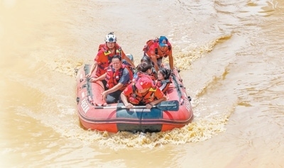 湖北省消防救援總隊前突小組黨員突擊隊在陜西省商洛市腰坪水庫開展搜救。圖為消防救援人員運送橡皮艇至作業(yè)水域。亓玉昆 李偉男攝影報道