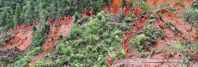 湖南省郴州市資興市八面山瑤族鄉(xiāng),消防救援人員穿越山體滑坡路段,徒步前往受災地區(qū)。李 科攝(人民視覺)
