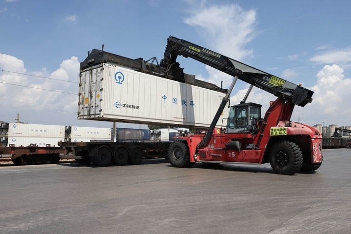 工作人員在中鐵聯(lián)集昆明中心站進(jìn)行裝卸車作業(yè)(2024年8月2日攝)。新華社記者 呂帥 攝