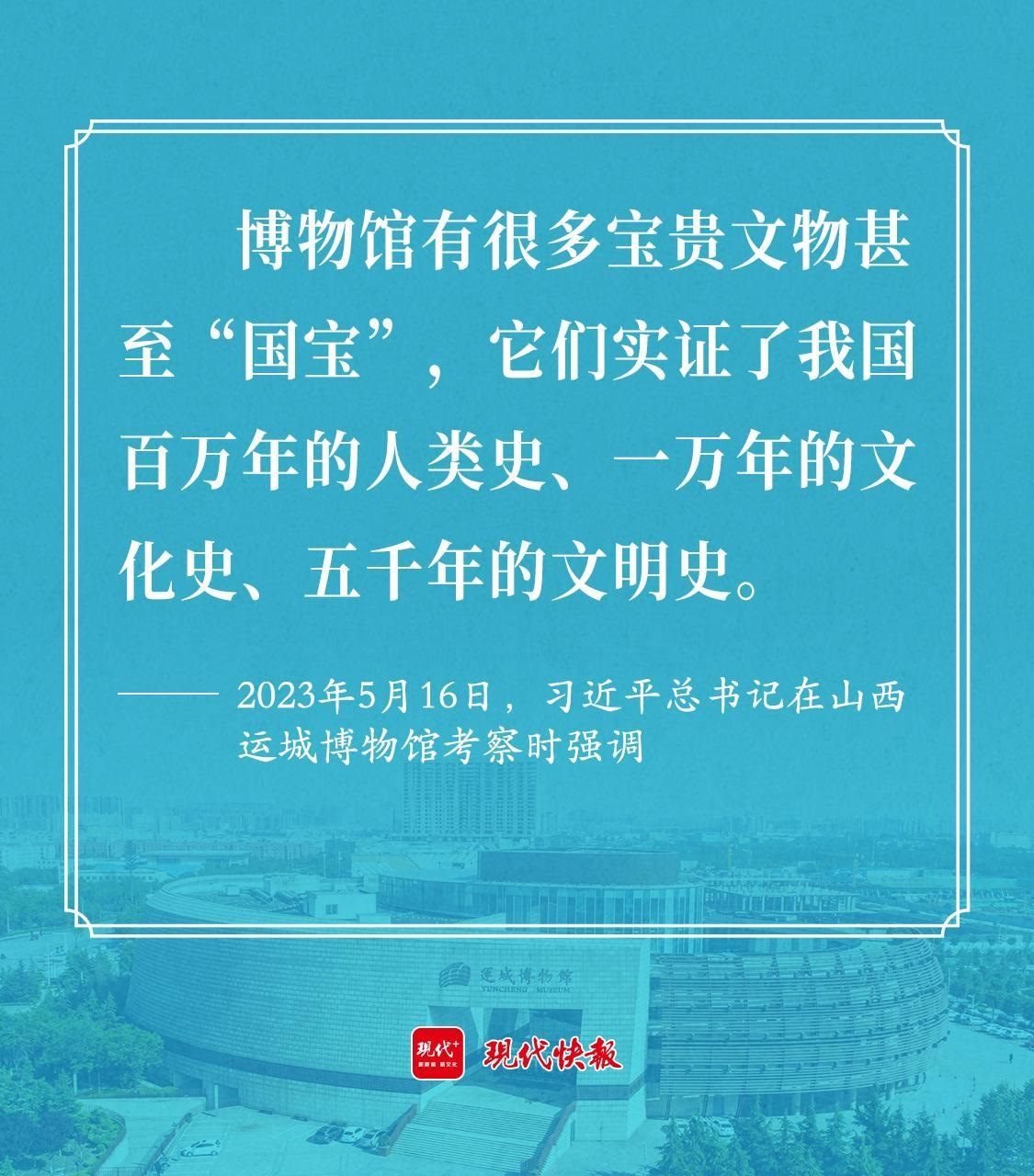2023年5月16日,習近平總書記考察山西運城博物館時強調(diào),博物館有很多寶貴文物甚至“國寶”,它們實證了我國百萬年的人類史、一萬年的文化史、五千年的文明史。