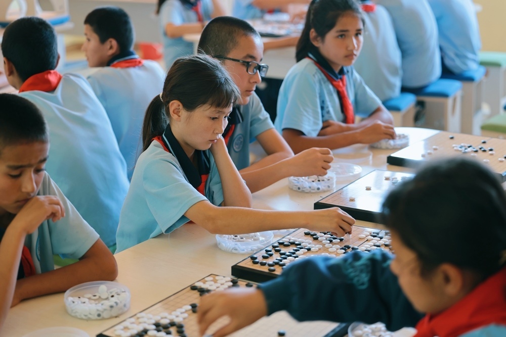 2024年9月23日,在新疆烏什縣依麻木鎮(zhèn)國家通用語言學校,學生們在下圍棋。新華社記者 任沁沁 攝