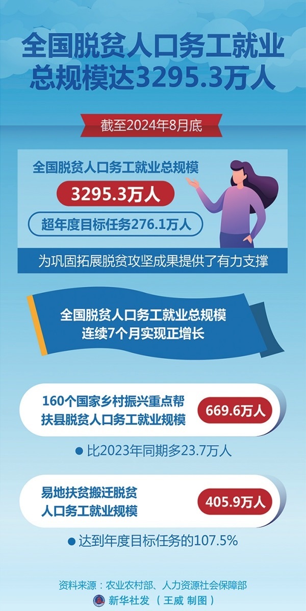 今年以來(lái)各級(jí)各相關(guān)部門(mén)深入開(kāi)展防止返貧就業(yè)攻堅(jiān)行動(dòng),截至8月底,全國(guó)脫貧人口務(wù)工就業(yè)總規(guī)模達(dá)到3295.3萬(wàn)人,超年度目標(biāo)任務(wù)276.1萬(wàn)人,為鞏固拓展脫貧攻堅(jiān)成果提供了有力支撐。 新華社發(fā) 王威/制圖
