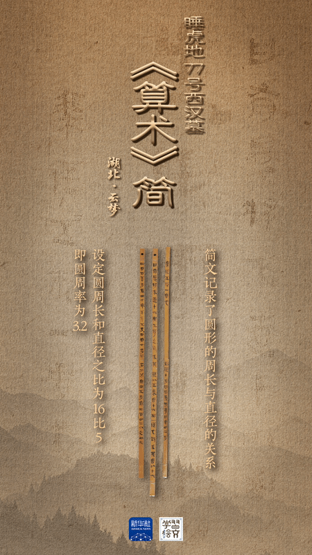 簡(jiǎn)牘里的《算術(shù)》,是古人科學(xué)智慧的精彩呈現(xiàn)。三枚關(guān)于計(jì)算圓形田地面積方法的西漢簡(jiǎn)牘保存完好,為首次公開展出?!坝斜瀸碇笔c五侍之”,睡虎地漢簡(jiǎn)中列舉的這道算術(shù)題顯示,周長(zhǎng)和直徑之比為16:5,即圓周率為3.2,證明秦漢之際已有人認(rèn)識(shí)到比3更精確的圓周率,為出土簡(jiǎn)牘所僅見,尤其珍貴。