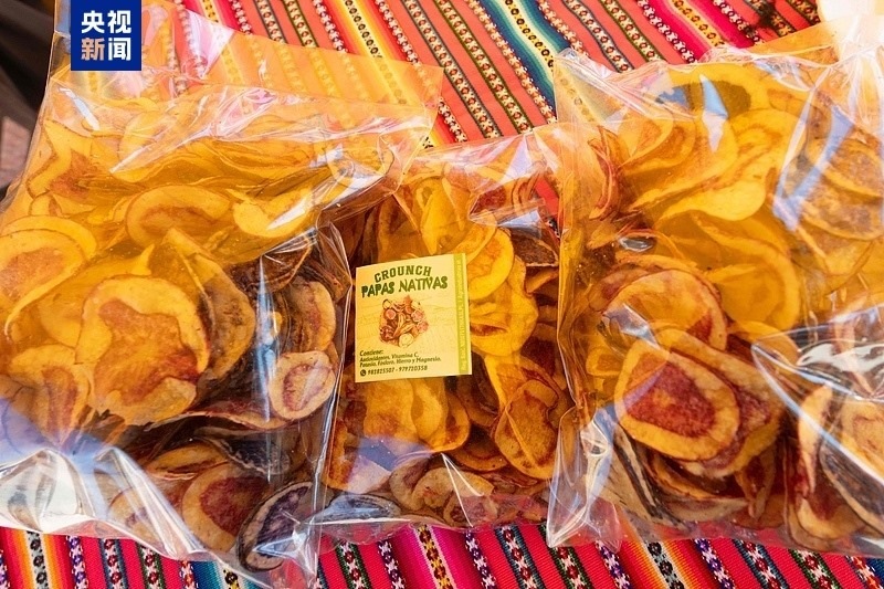 △今年5月30日,秘魯慶祝首個“國際馬鈴薯日”。當?shù)匾粋€街頭市場上,展示著用馬鈴薯制成的薯片。