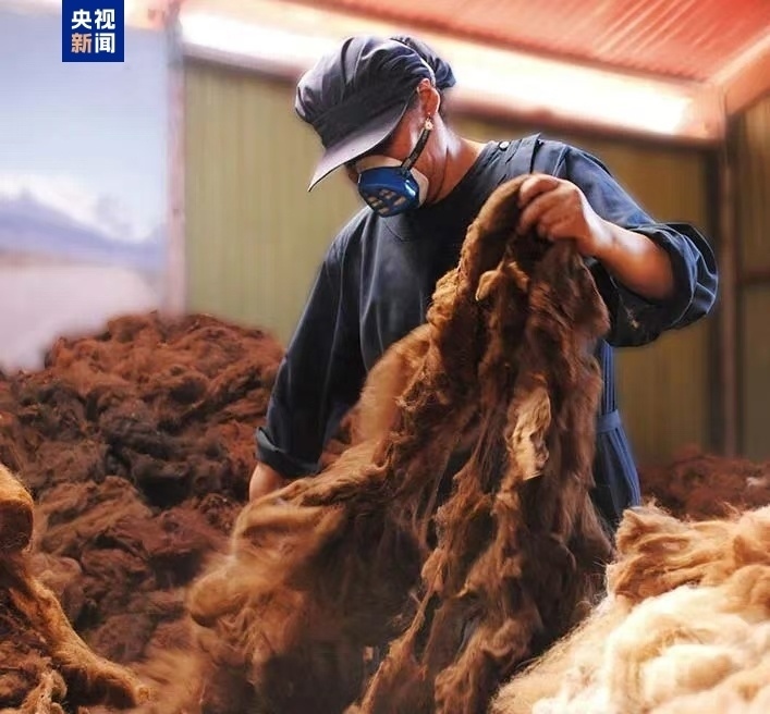 △在位于“世界羊駝之都”秘魯阿雷基帕的一家羊駝毛編織工作室里,一名安第斯紡織工正在整理羊駝毛。