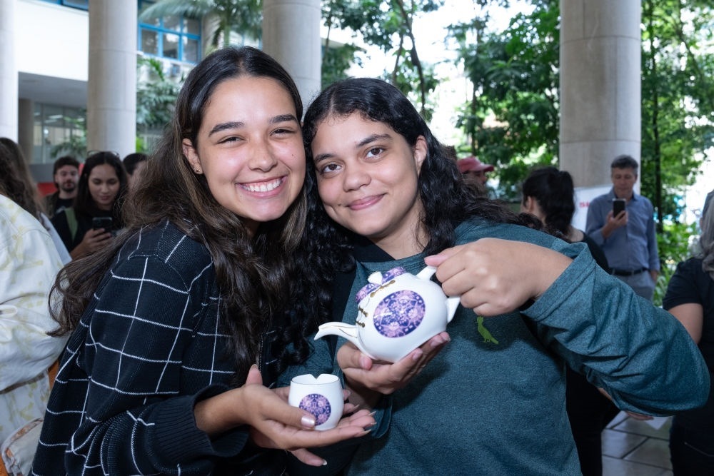 2024年4月18日,在巴西里約熱內盧舉行的聯(lián)合國中文日活動上,巴西學生手持中國工藝品合影。