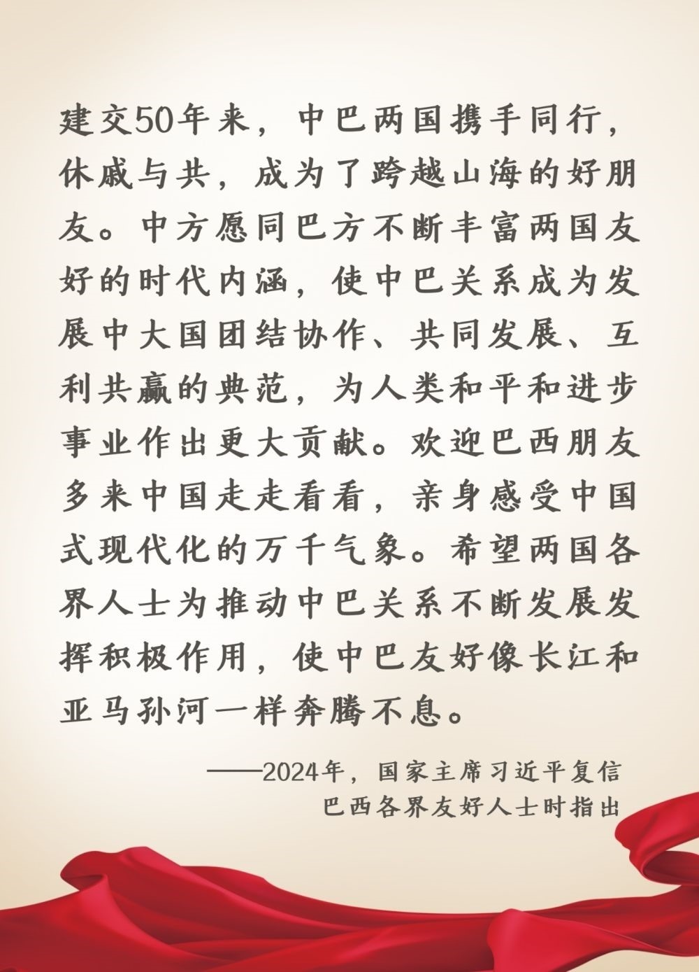 2023年4月,習近平主席同來華進行國事訪問的巴西總統(tǒng)盧拉舉行會談時,談到雙方要以2024年慶祝建交50周年為契機,繼續(xù)推動中巴友好。