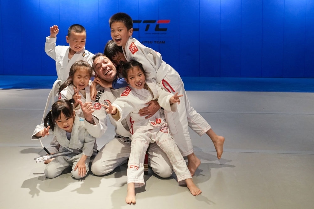 2023年4月7日,在北京一家格斗館內,巴西柔術教練席爾瓦(中)在一堂柔術課結束后與學生們合影留念。為了更好地了解中國和傳統(tǒng)武術,席爾瓦于2016年來到北京,在一家格斗館擔任巴西柔術教練。