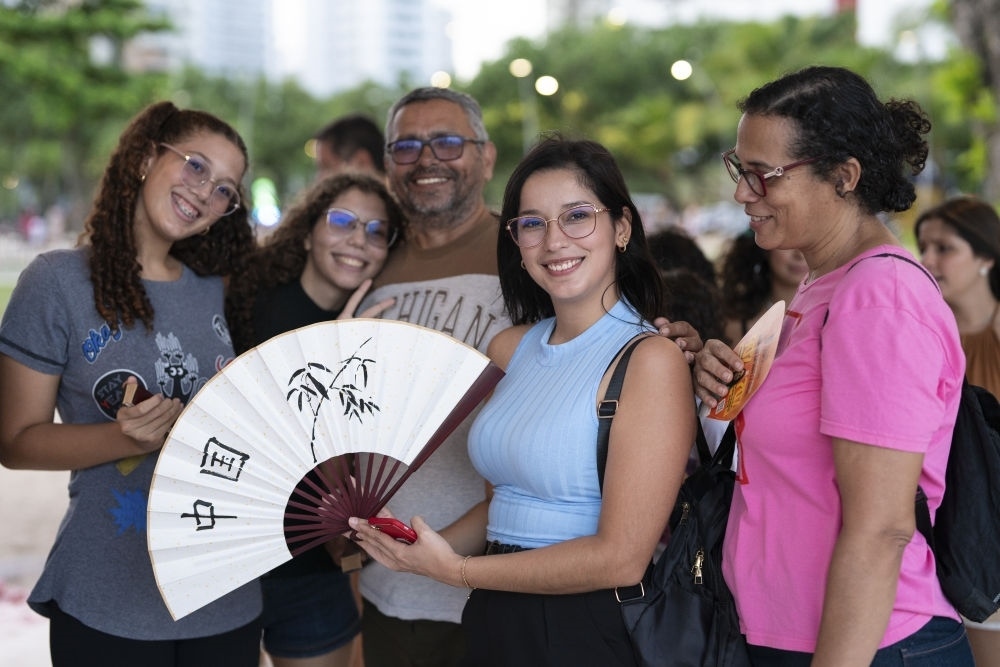 2024年2月3日,一名女子在巴西累西腓舉行的中國春節(jié)慶?;顒由险故咀约簳鴮懙纳让?。