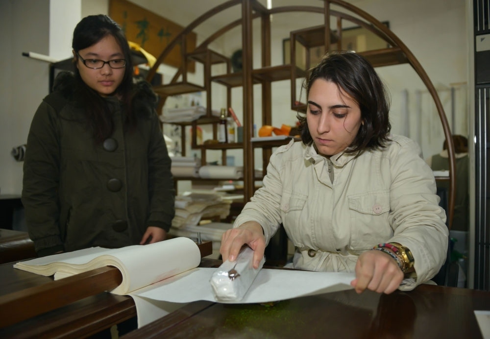 2012年12月20日,巴西留學生瑪麗安娜(右)在杭州一家藝術館體驗傳統(tǒng)木版水印技藝。