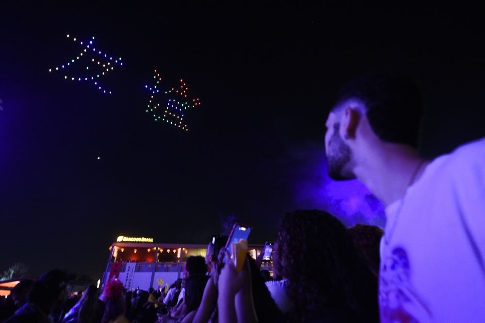 2024年8月17日,在巴西首都巴西利亞,人們在沙灘藝術節(jié)中國日活動上觀看無人機表演。