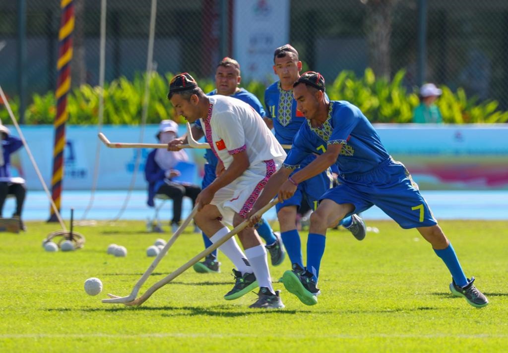 ??11月24日,在三亞市體育中心舉行的第十二屆全國(guó)少數(shù)民族傳統(tǒng)體育運(yùn)動(dòng)會(huì)室外表演項(xiàng)目中,新疆隊(duì)球員阿卜杜拉艾孜則·阿卜杜海娃爾(前右)在麥熱球表演中。新華社記者 陳朔 攝