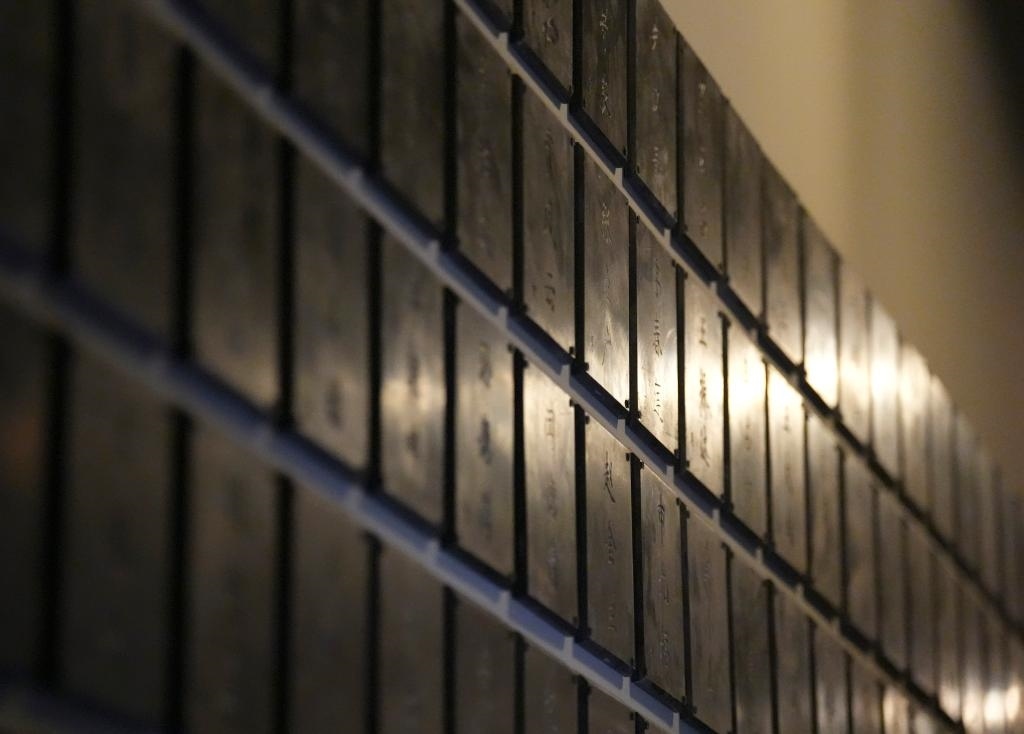 在侵華日軍第七三一部隊本部舊址展出的殉難者名單墻(12月12日攝)。新華社記者 王松 攝