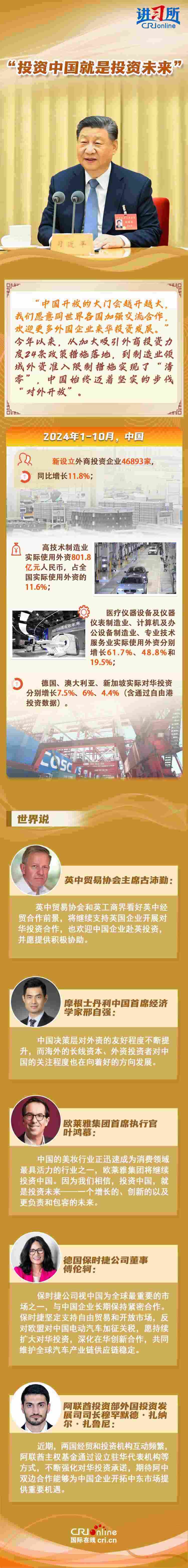 “中國是實干家、行動派。”今年以來,從習近平主席的歐洲之行到拉美之行,再到四天前在北京會見主要國際經(jīng)濟組織負責人,習近平一直強調(diào),中國的發(fā)展將給世界帶來巨大機遇。據(jù)聯(lián)合國貿(mào)易和發(fā)展會議不久前發(fā)布的《世界投資報告2024》中文版顯示,中國吸引外資的結構不斷優(yōu)化、質量不斷提高,多位政商界人士也認為中國是一個非常有前景的市場,投資中國就是投資未來。