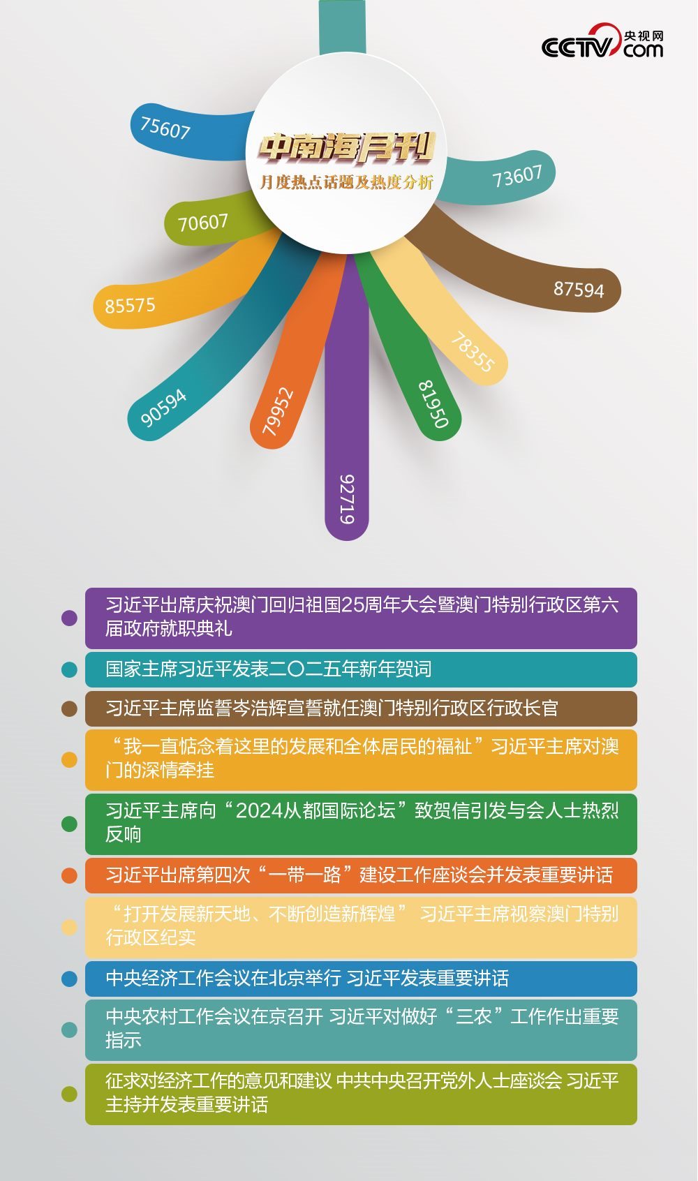 南海風(fēng)起,百舸爭流。盛世蓮花,灼灼生華。央視網(wǎng)“智聞”系統(tǒng)提取分析2024年12月全網(wǎng)時(shí)政新聞熱點(diǎn),習(xí)近平主席澳門之行吸引全網(wǎng)關(guān)注。