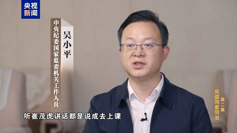 中央紀(jì)委國家監(jiān)委機關(guān)工作人員 吳小平:崔茂虎特別能講,講起工作來都是長篇大論的,所以麗江當(dāng)?shù)匾恍└刹棵看稳ラ_會,聽崔茂虎講話都說成去上課,去聽崔老師講課,實際上散了會就開始到別墅里面跟商人老板在一起吃喝玩樂。