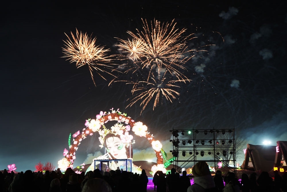 2025年1月12日,游客們?cè)谏蜿柹虮毙聟^(qū)稻夢(mèng)小鎮(zhèn)觀看焰火表演。