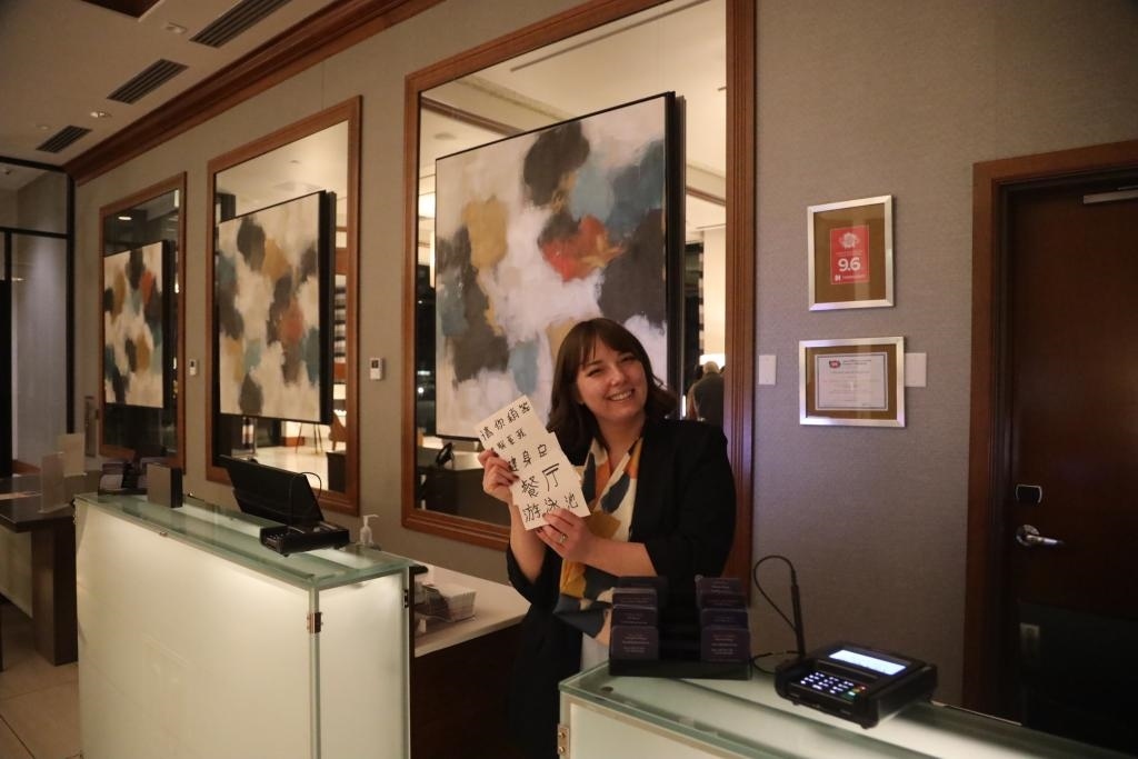 當(dāng)?shù)貢r(shí)間1月28日,馬斯卡廷一家酒店前臺(tái)工作人員謝伊·馬丁展示自己為迎接中國學(xué)生而手繪的中文指引卡片。新華社記者徐劍梅攝