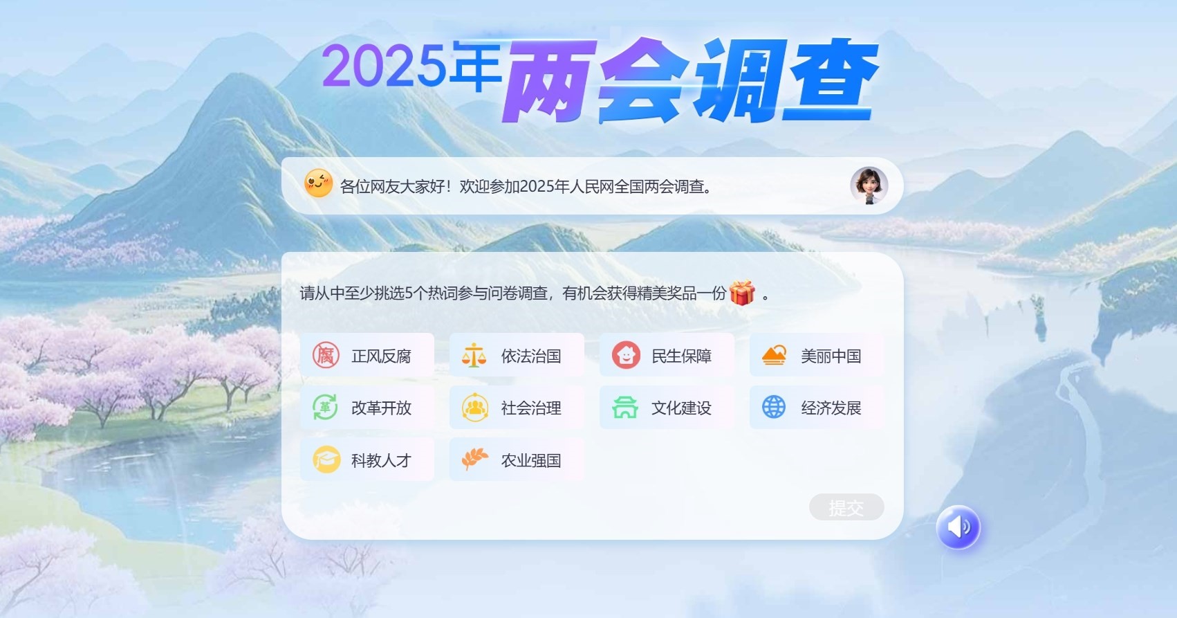 調(diào)查還在火熱進(jìn)行,各界可繼續(xù)通過(guò)人民網(wǎng)全媒體通道參與本次調(diào)查。為感謝網(wǎng)友對(duì)人民網(wǎng)2025年全國(guó)兩會(huì)調(diào)查的支持,參與者有機(jī)會(huì)抽取精美獎(jiǎng)品。