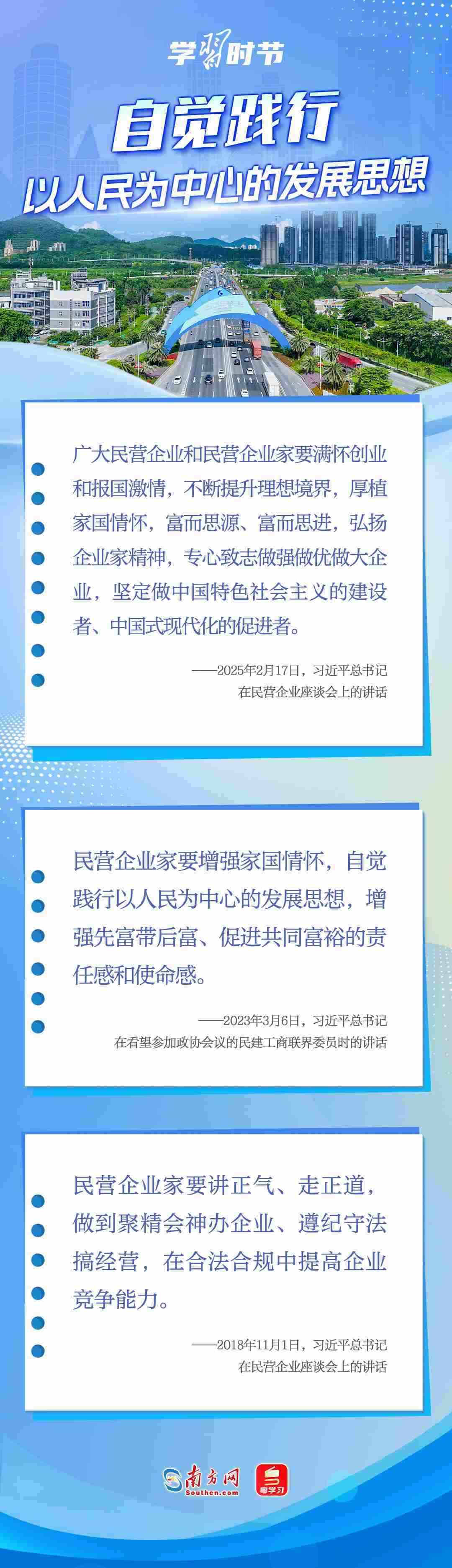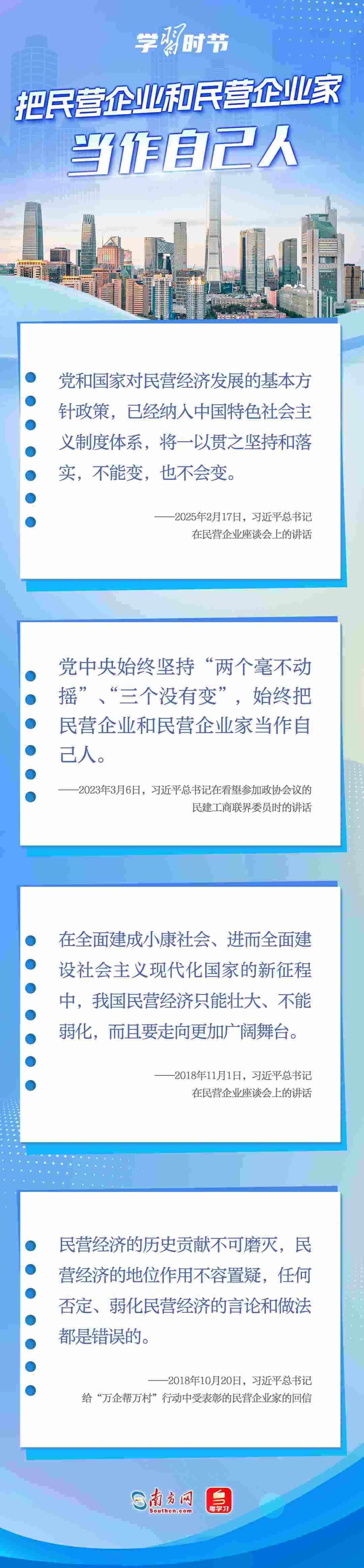 黨的十八大以來,習(xí)近平總書記對(duì)民營經(jīng)濟(jì)發(fā)展高度重視、念茲在茲,多次重申堅(jiān)持“兩個(gè)毫不動(dòng)搖”的重要方針,強(qiáng)調(diào)鼓勵(lì)、支持、引導(dǎo)非公有制經(jīng)濟(jì)繼續(xù)發(fā)展壯大,為實(shí)現(xiàn)民營經(jīng)濟(jì)健康發(fā)展、高質(zhì)量發(fā)展注入強(qiáng)大信心和動(dòng)力。讓我們一起學(xué)習(xí)習(xí)近平總書記關(guān)于民營經(jīng)濟(jì)的重要論述,在關(guān)鍵時(shí)刻讓民營企業(yè)和民營企業(yè)家堅(jiān)定發(fā)展信心,踏踏實(shí)實(shí)謀發(fā)展。