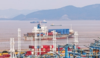 執(zhí)行“中歐快航”航線首航的“嘉華寧波”輪駛離寧波舟山港。
