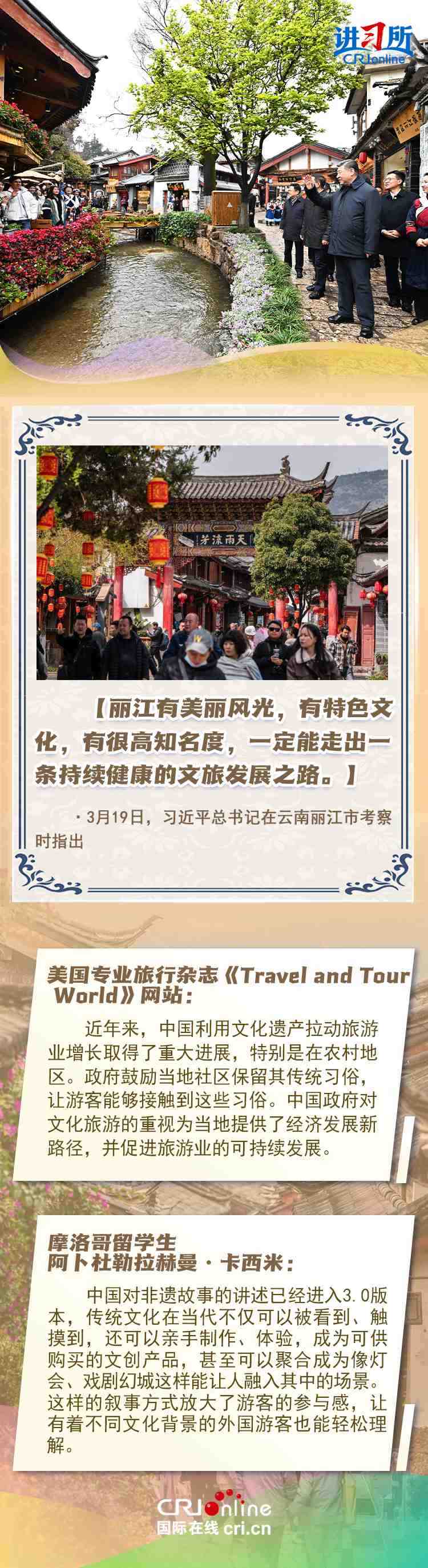 習近平總書記近日赴貴州、云南考察。他走進民族特色村寨、歷史文化古城,心系歷史文化遺產(chǎn)保護和文旅融合發(fā)展。習近平特別叮囑當?shù)毓賳T和群眾,既要保護有形的村落、民居、特色建筑風貌,傳承無形的非物質(zhì)文化遺產(chǎn),又要推動其創(chuàng)造性轉(zhuǎn)化、創(chuàng)新性發(fā)展。