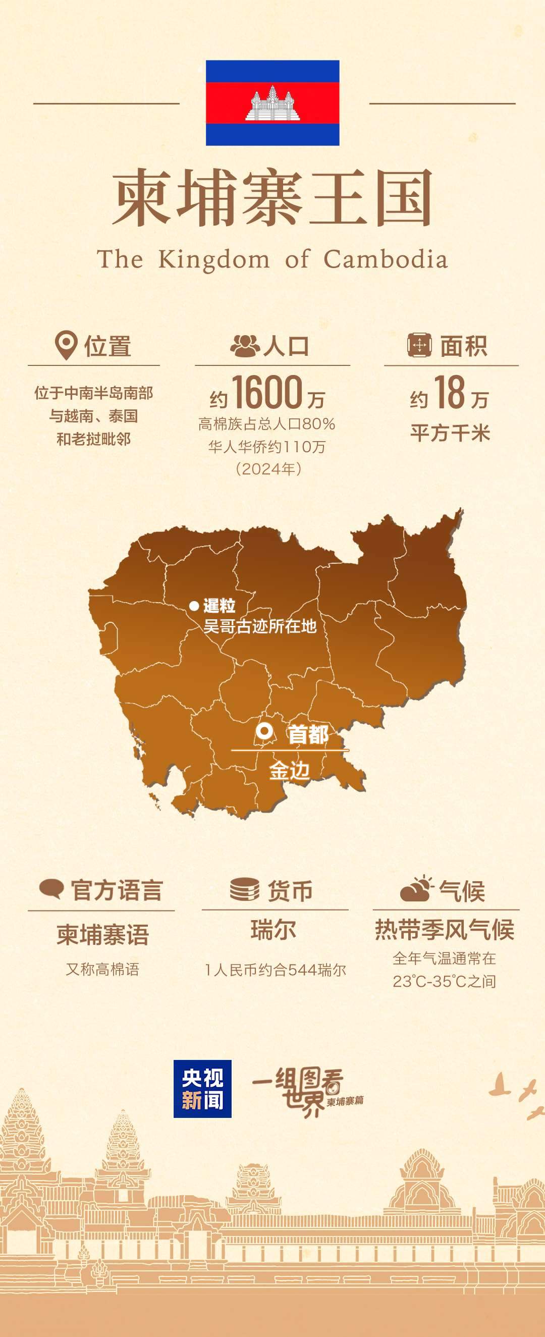 從國(guó)旗上的千年古跡吳哥窟,到湄公河畔會(huì)“呼吸”的洞里薩湖;從元代周達(dá)觀筆下的《真臘風(fēng)土記》,到與中國(guó)結(jié)下深厚情誼的西哈努克;從共建“一帶一路”的金港高速公路,到“鉆石六邊”合作架構(gòu)不斷充實(shí)……通過(guò)一組圖,帶您了解中國(guó)的這個(gè)“鐵桿”朋友——柬埔寨↓↓↓