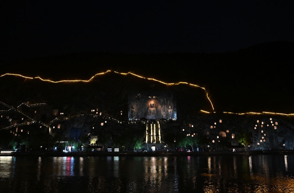 2025年4月24日,游客在龍門石窟夜游。