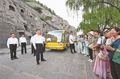 已有1500多年歷史的龍門(mén)石窟,是重要的世界文化遺產(chǎn)。習(xí)近平來(lái)到這里,察看石窟整體布局風(fēng)貌和代表性窟龕、造像,同現(xiàn)場(chǎng)的文物保護(hù)工作者親切交流。他強(qiáng)調(diào),要把這些中華文化瑰寶保護(hù)好、傳承好、傳播好。游客們見(jiàn)到總書(shū)記,都十分欣喜,紛紛向總書(shū)記問(wèn)好。習(xí)近平不時(shí)同大家交流,特別鼓勵(lì)小朋友們多到實(shí)地尋溯中華文化,從小樹(shù)立文化自信。他指出,文旅融合前景廣闊,要推動(dòng)文旅產(chǎn)業(yè)高質(zhì)量發(fā)展,真正打造成為支柱產(chǎn)業(yè)、民生產(chǎn)業(yè)、幸福產(chǎn)業(yè)。