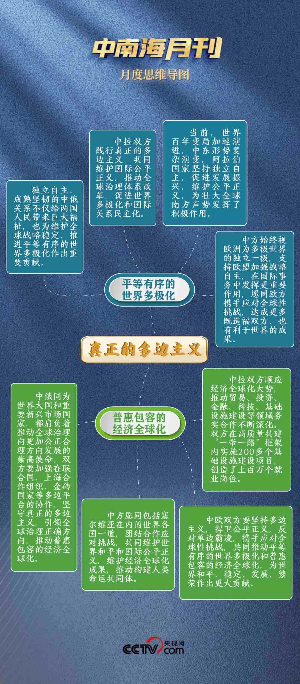面對單邊主義逆流,堅定不移推動平等有序的世界多極化。不為一時一事所惑,不為風高浪急所擾,與俄方達成“共同弘揚正確二戰(zhàn)史觀,維護聯(lián)合國權(quán)威和地位,維護國際公平正義”的共識;與歐盟“深化戰(zhàn)略溝通,增進理解互信,鞏固伙伴定位”;同拉方攜手啟動團結(jié)、發(fā)展等五大工程,推動中國同全球南方國家相互支持、團結(jié)合作。