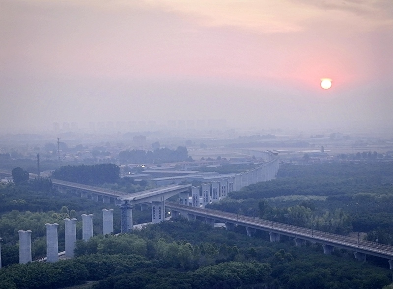轉(zhuǎn)體前的雄忻高鐵雄保段跨京廣高鐵轉(zhuǎn)體橋(6月17日攝,無人機(jī)照片)。