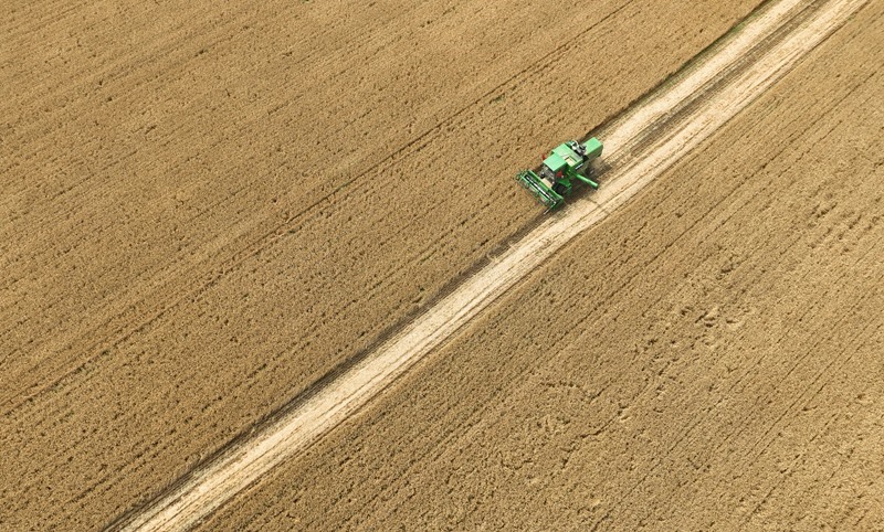 6月18日,在河北石家莊晉州市周家莊鄉(xiāng)北捏盤村麥田,農(nóng)戶駕駛秸稈打捆機(jī)作業(yè)。