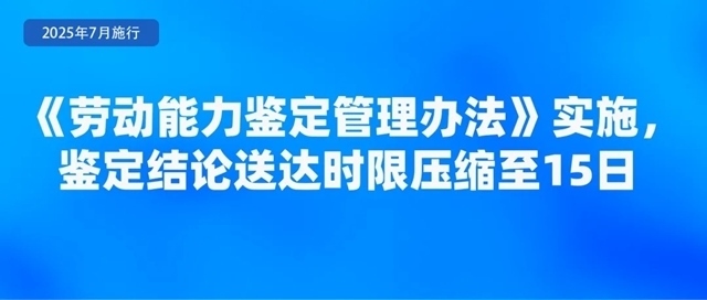 人力資源社會(huì)保障部、國家衛(wèi)生健康委聯(lián)合印發(fā)的《勞動(dòng)能力鑒定管理辦法》,自2025年7月1日起施行?!掇k法》明確,工傷職工和因病或非因工致殘申請領(lǐng)取病殘津貼人員申請勞動(dòng)能力鑒定適用本辦法。勞動(dòng)能力鑒定分為初次鑒定和再次鑒定,對初次鑒定不服可以申請?jiān)俅舞b定,再次鑒定為最終結(jié)論。《辦法》強(qiáng)調(diào),要加強(qiáng)便民服務(wù),減少不必要材料,信息共享能夠獲取的申請材料不得要求申請人重復(fù)提交;壓縮鑒定時(shí)限,將結(jié)論送達(dá)時(shí)限從20日壓縮至15日;加強(qiáng)無障礙環(huán)境建設(shè),完善無障礙服務(wù)設(shè)施設(shè)備。