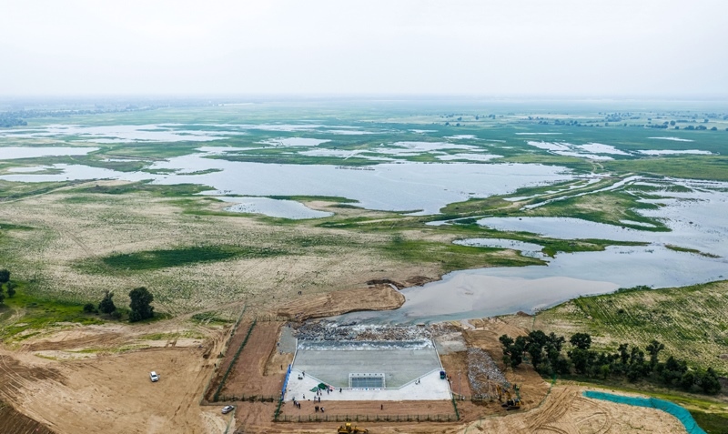 6月30日拍攝的引綽濟遼工程通遼市莫力廟水庫出水口(無人機照片)。