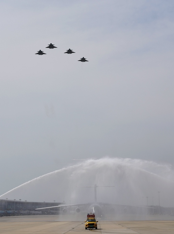 9月12日,第十二批在韓中國人民志愿軍烈士遺骸回國。這是在沈陽桃仙國際機(jī)場,接運(yùn)烈士遺骸回國的運(yùn)-20專機(jī)在4架殲-20飛機(jī)伴飛護(hù)航下即將降落。
