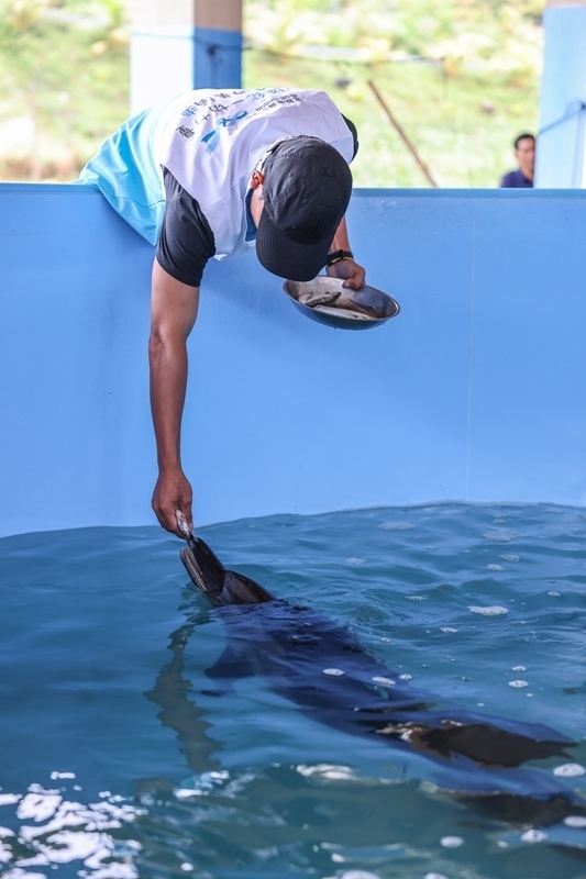 9月14日,在位于海南陵水的救助中心,救助人員給海豚“萬萬”喂食。