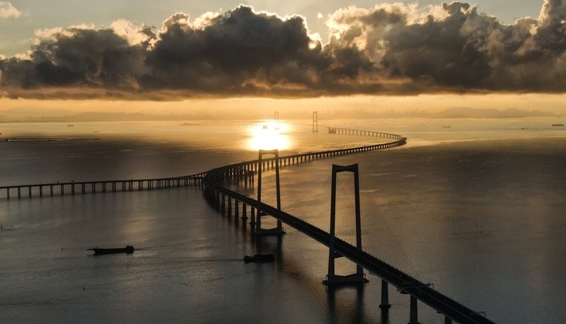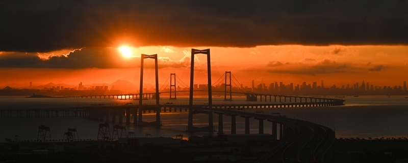 珠江口伶仃洋上,深中通道沐浴在晨曦之中,長(zhǎng)虹臥波、美不勝收。