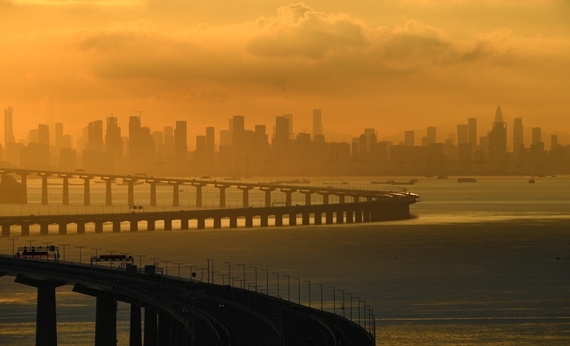 9月14日拍攝的沐浴在晨曦之中的深中通道與遠(yuǎn)處的深圳市區(qū)。