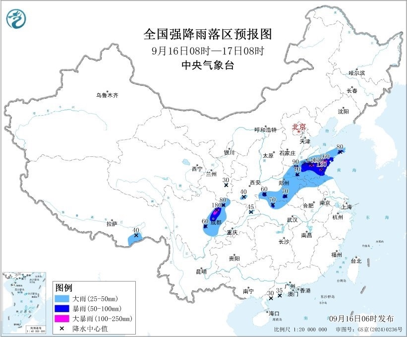預(yù)計,9月16日8時至17日8時,四川盆地中西部、甘肅南部、河南中東部、山東中南部以及蘇皖北部等地部分地區(qū)有大到暴雨,其中,山東中南部、四川盆地北部等地部分地區(qū)有大暴雨(100~180毫米)。上述部分地區(qū)伴有短時強降水(最大小時降雨量20~50毫米,局地可超過70毫米),局地有雷暴大風(fēng)等強對流天氣。