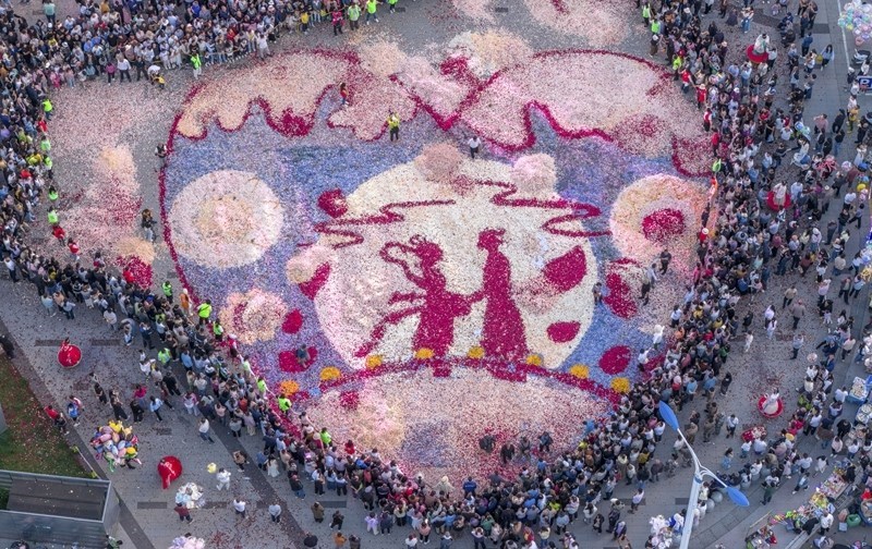 8月29日七夕節(jié),人們在云南省昆明市晉寧區(qū)觀看用玫瑰花瓣鋪就的巨幅圖景《云間鵲橋·花雨鋪路》(無人機照片)。